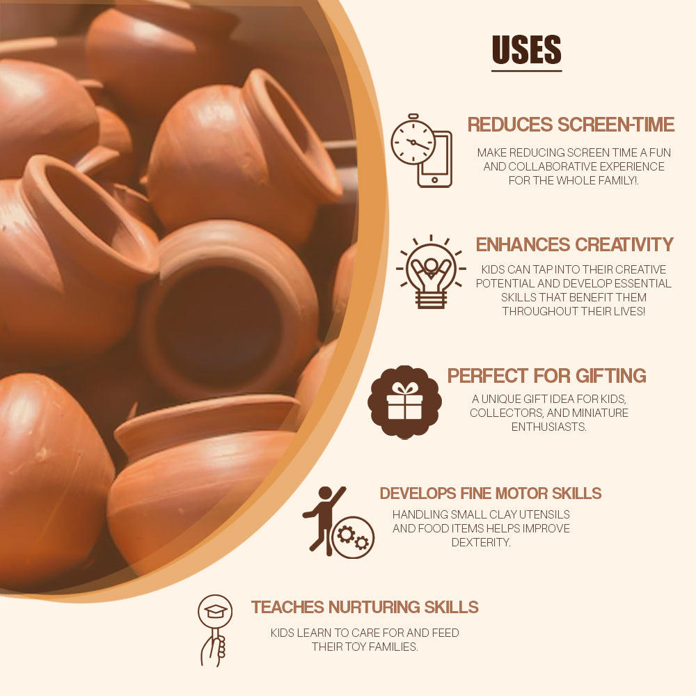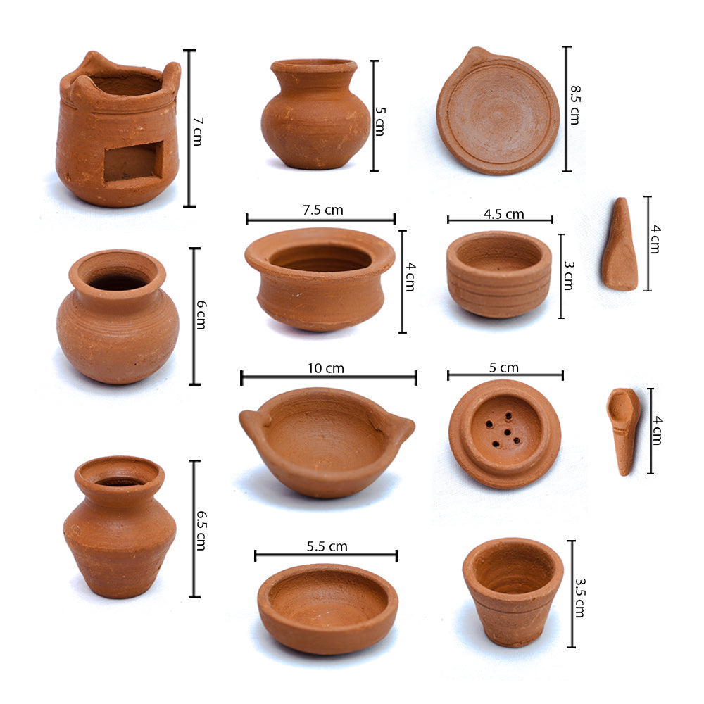 Each piece reflects traditional craftsmanship, making it perfect for imaginative play, miniature cooking videos, storytelling setups, and decorative village themes. The earthy texture and natural finish add a rustic aesthetic, creating a warm and nostalgic experience.