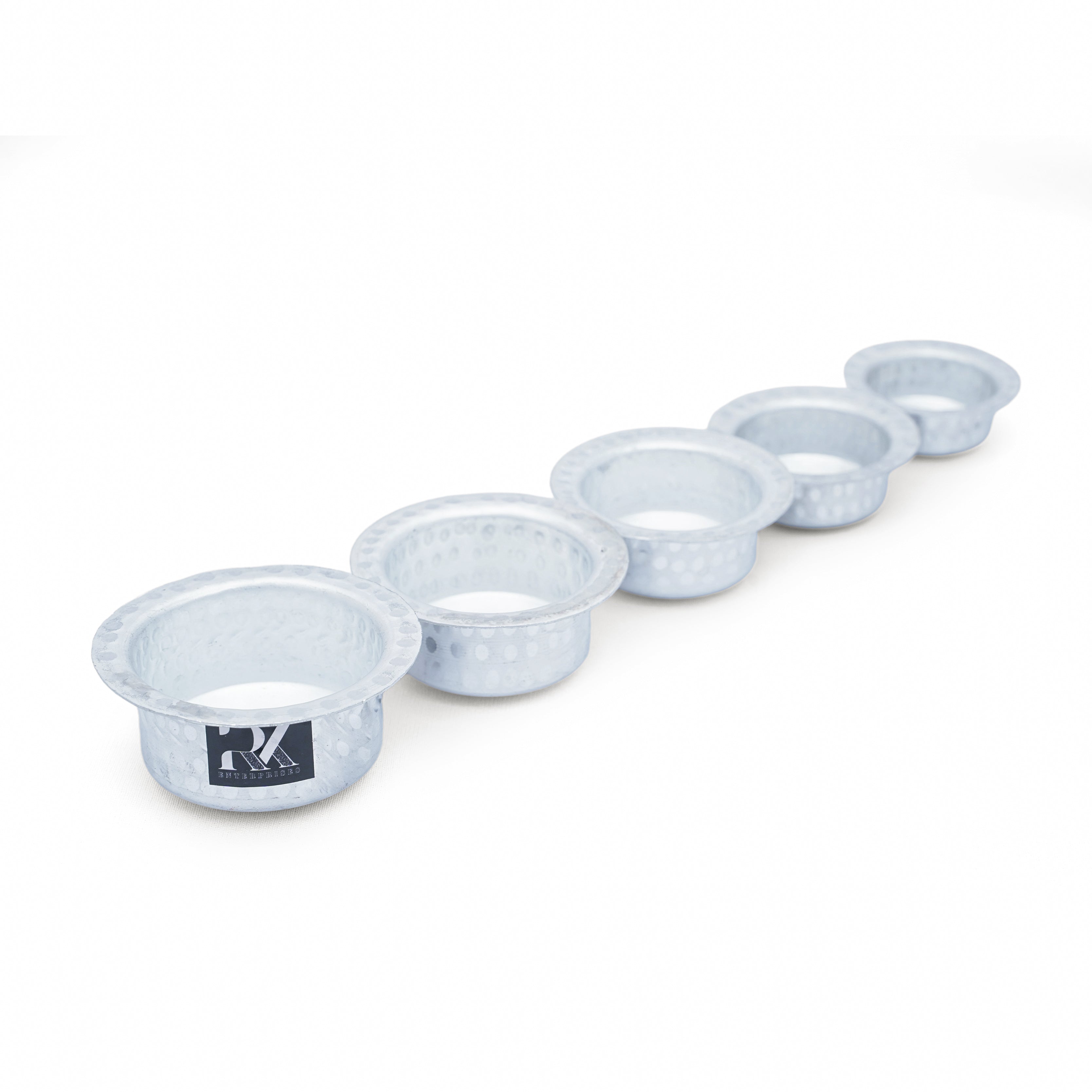 The Miniature Aluminium Dabbara Set includes 5 dabbara cups in decreasing sizes, designed for children’s play kitchens and miniature setups.
