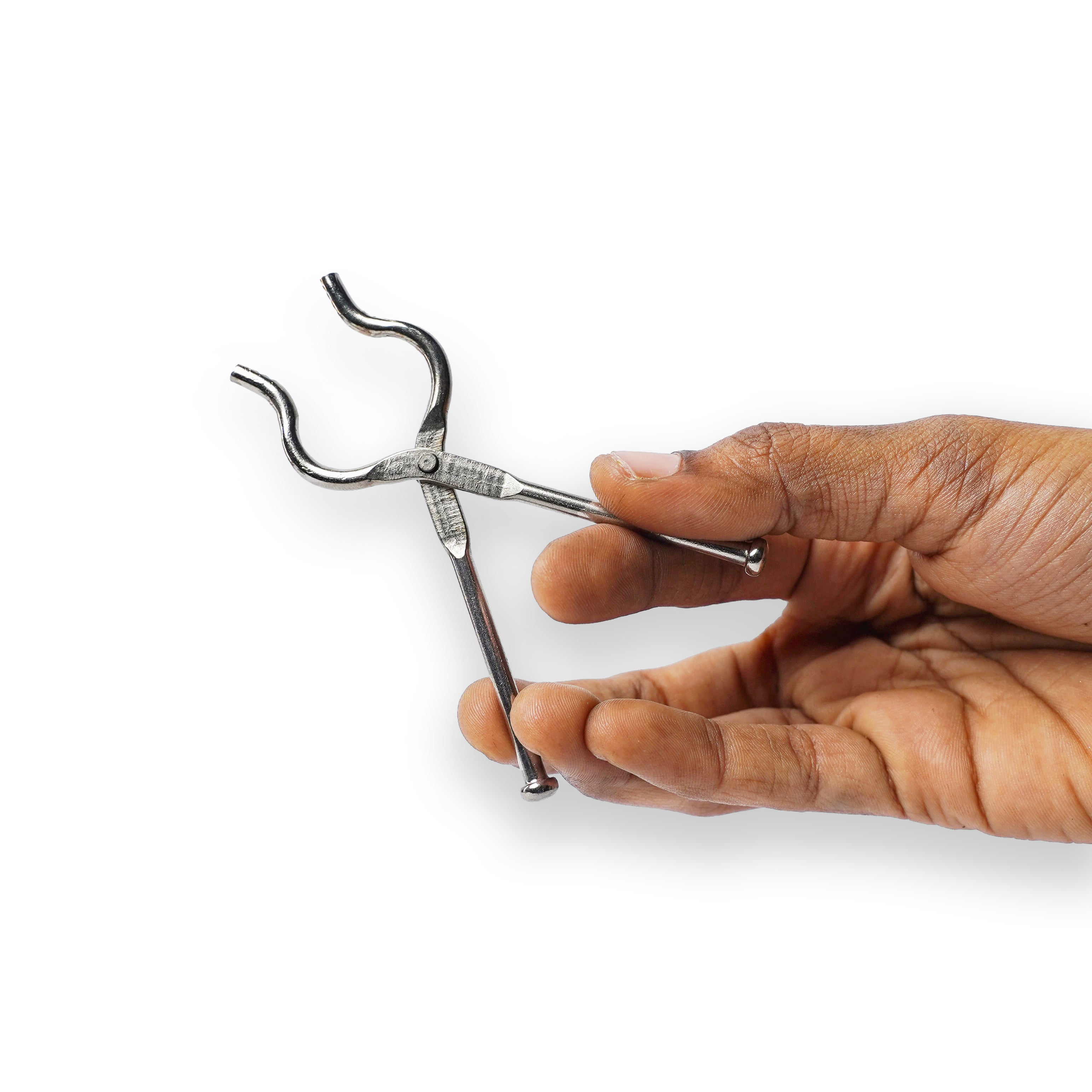 The Miniature Steel Tong Pakkad is a realistic miniature tool designed to resemble traditional kitchen tongs used for handling hot vessels.